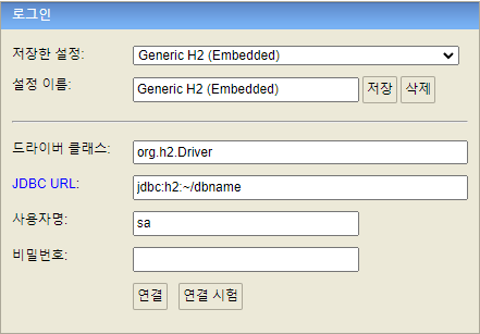 1. H2 콘솔에서 Generic H2(Server)로 접속하기 전 Generic H2(Embedded)로 데이터베이스를 입력 후 연결버튼을 클릭하여 데이터베이스를 생성해준다.