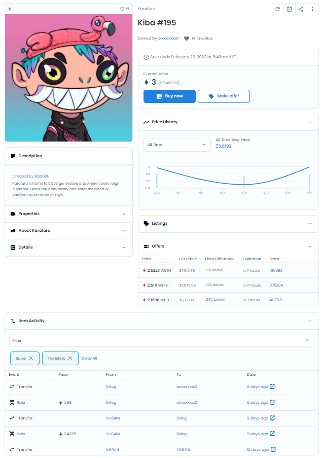 오른쪽의 Kiba #195는 작품명입니다. 아래에는 현재 소유자가 누구인지 기재되어있고, 좋아요는 몇개인지, 현재 가격과 판매기간이 언제까지인지 알 수 있습니다. Price History는 가격의 그래프를 확인할 수 있는 부분이고, Listings는 가격표가 현재 어떻게 붙어 왔었는지, Offers는 가격협상제안이 어떻게 들어왔는지 확인할 수 있습니다.