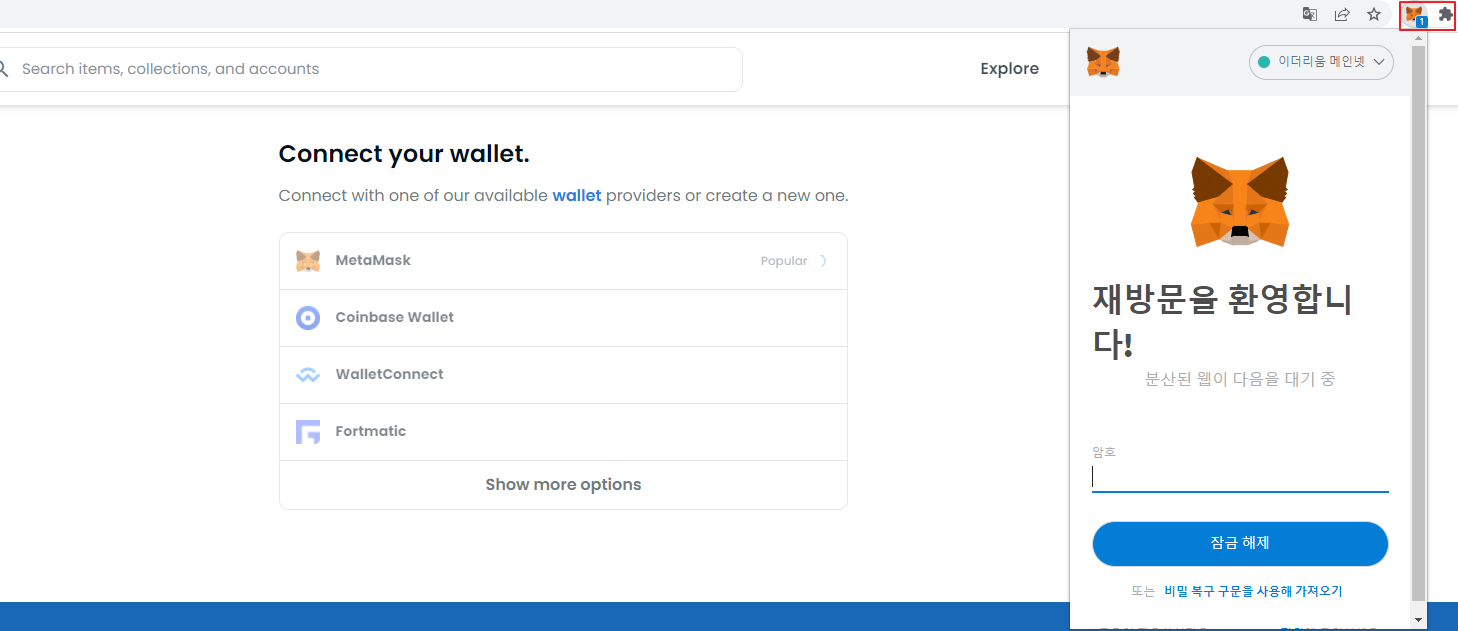 거기서 로그인하시면 OpenSea에서도 로그인이 됩니다.