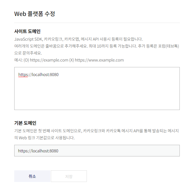 ※ 사이트 도메인 항목에 사용할 도메인을 작성하며, localhost의 경우 아래와 같이 포트번호와 함께 저장해주면 된다.