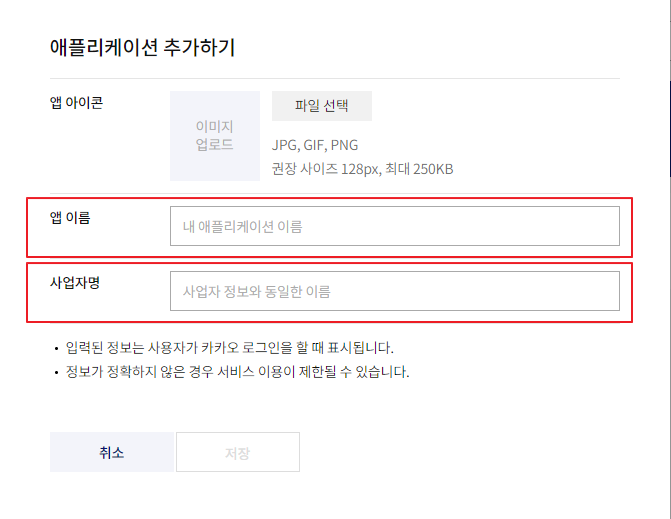 ④ 앱 이름, 사업자명을 입력한다. (앱 아이콘은 있을 시 선택)