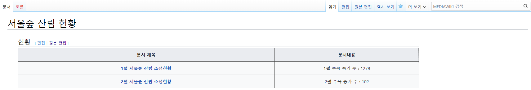 - 구현해야 할 기능 : '서울숲 산림 현황' 이라는 문서를 통해 1 ~ 12월 문서의 제목과 특정 일부 내용까지 미리보기식으로 조회할 수 있어야 한다.
