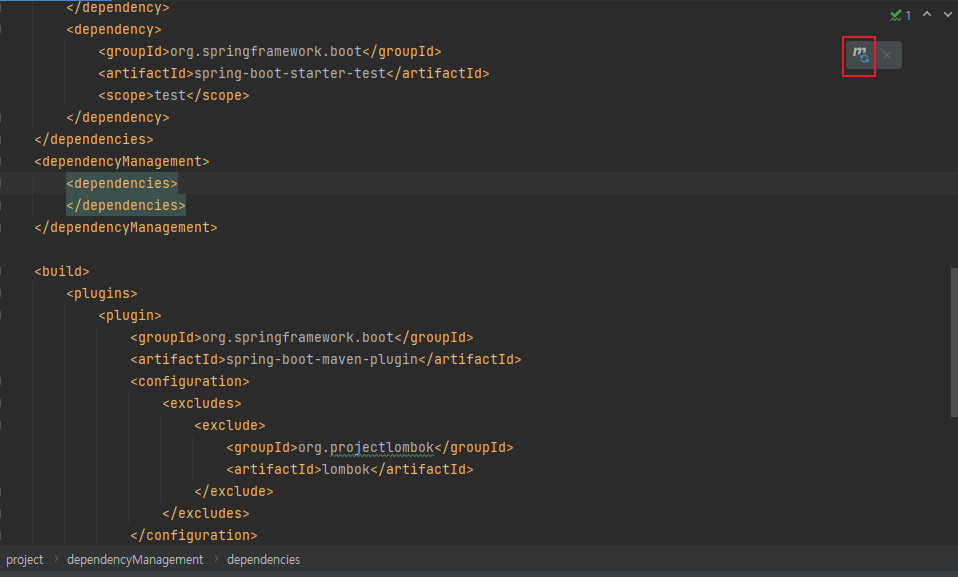 pom.xml 파일의 dependency 하나를 지워 Load Maven Changes 아이콘을 출력시켜 변경 내역을 반영하고,