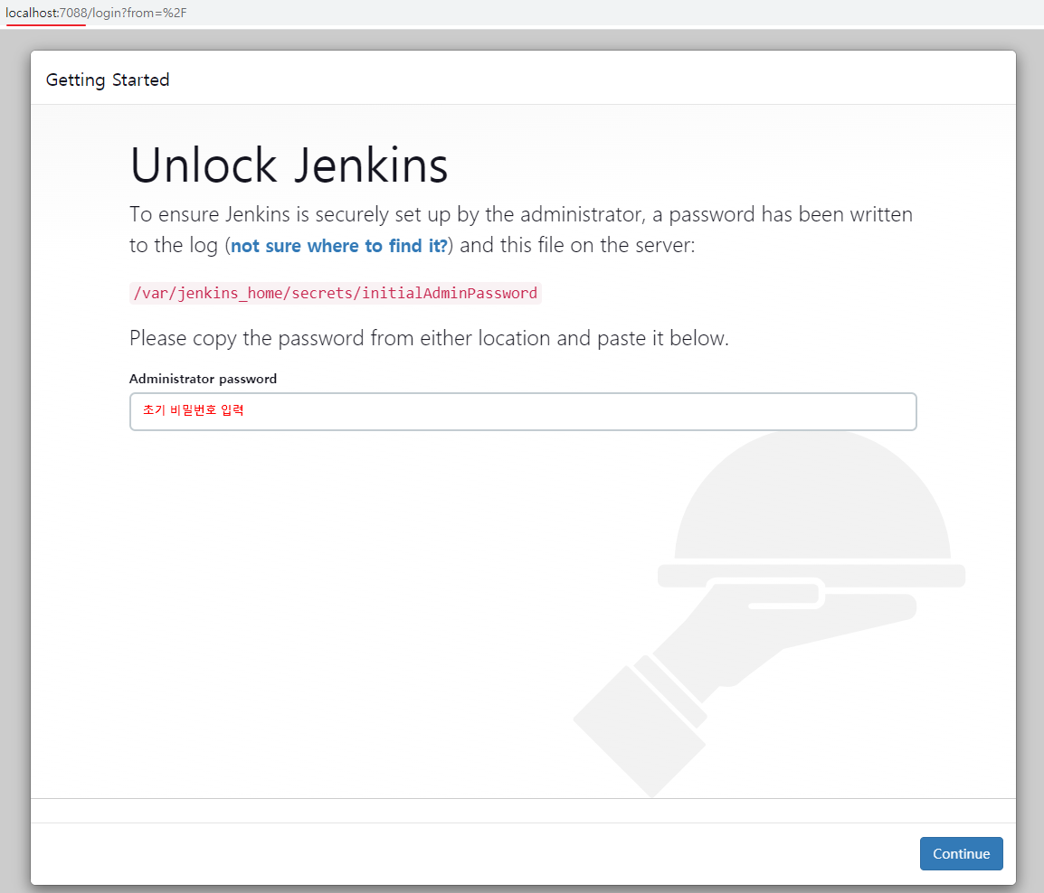 그리고 브라우저를 켜서 localhost:7088 ({호스트 IP주소:호스트 jenkins 웹 인터페이스 PORT}) 로 접속한다.