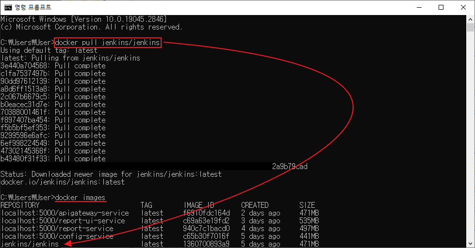 공식 레퍼런스에서 제공하는 설치 방법대로 cmd창을 열고 아래의 명령어를 입력하면, jenkins 도커 이미지를 받는다.