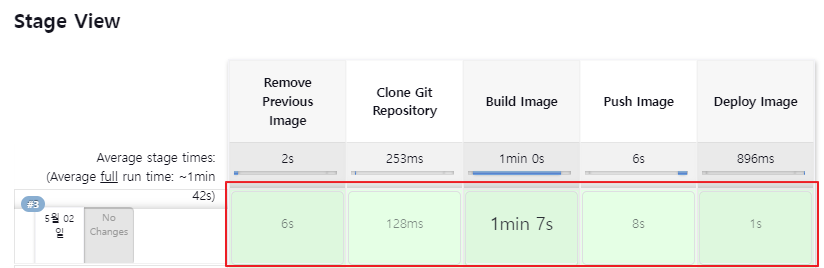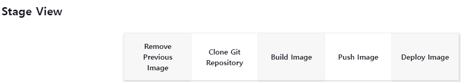 - stage : jenkins 빌드 시에 각 단계를 순서대로 실행, 아래 이미지처럼 jenkins에서 아이템의 대시보드에서 Stage View를 통해 각 단계별 진행 상태 확인 가능