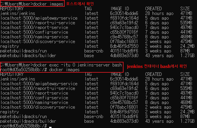 그렇기 때문에, 호스트 cmd 창에서 docker images 명령어를 실행하면, Docker 이미지 목록이 출력된다.