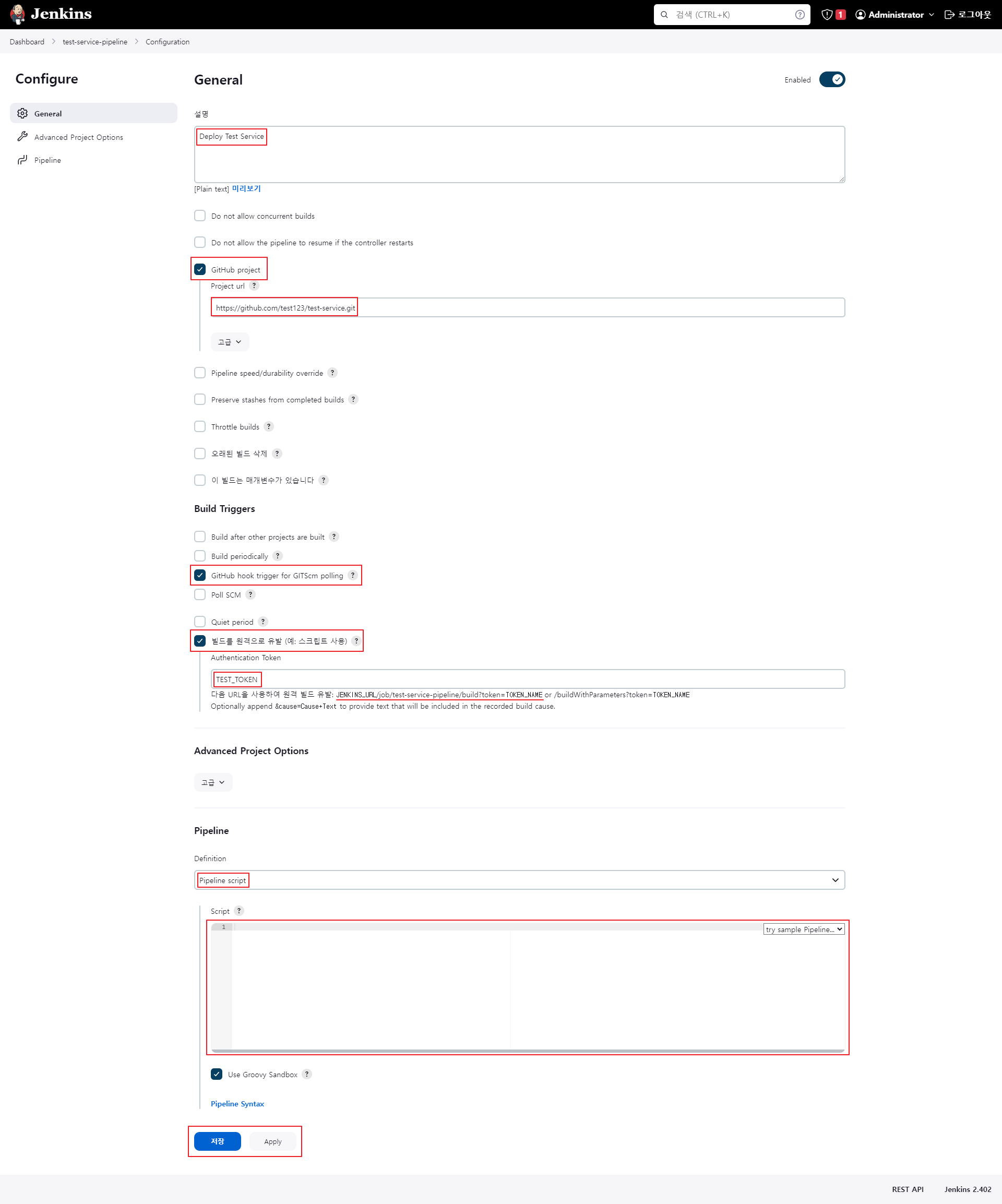 그리고 연동할 GitHub 정보와 사용할 인증 토큰 정보, Script 등을 작성해주면 된다. Script는 별도로 작성할 것이기 때문에 제외하고 나머지를 작성한 최종 정보는 아래와 같다.