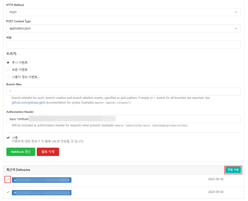 만들어놓은 gitea의 웹훅에 들어가보면 아래쪽에 '전달 시험' 버튼이 있다.