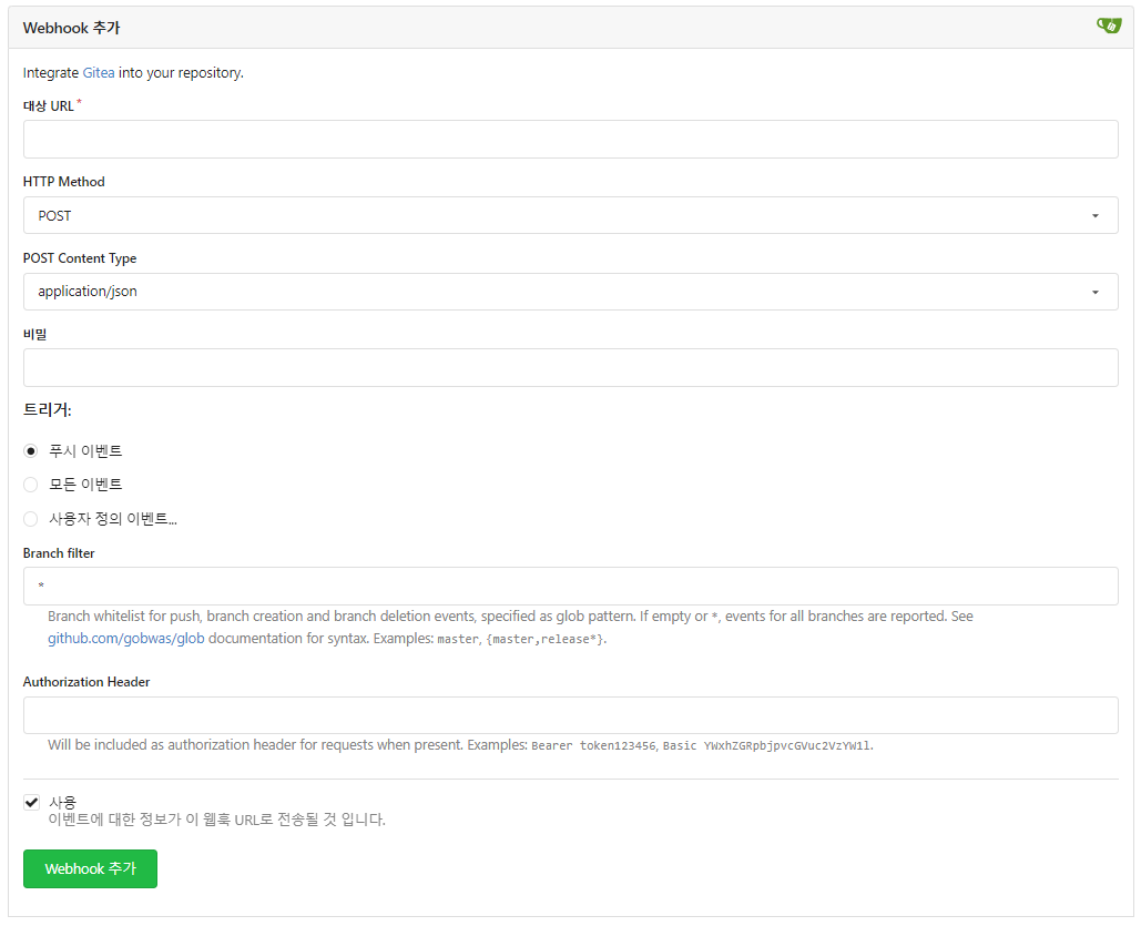 근데 찾아보니 gitea와 github는 웹훅 설정 시 차이가 있다. 아래 이미지는 gitea의 웹훅 추가 화면인데, github에는 gitea와 다르게 Authorization Header를 설정하는 부분이 없다. 대신 github에서는 Secret 값을 설정하여 검증하는 것 같다.