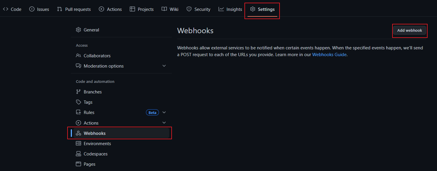 즉, Git에 push 같은 이벤트가 발생했다면 jenkins에 정보를 전달해준다. 웹훅은 git에서 생성할 수 있으며, 보통 레퍼지토리의 설정에서 생성할 수 있다.