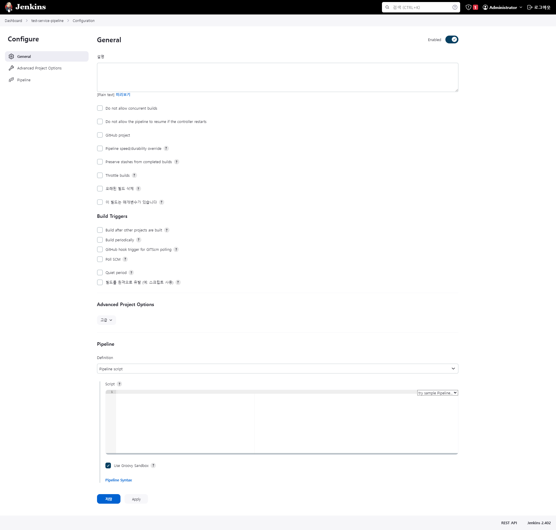 여러 가지 종류를 선택할 수 있지만, 나는 파이프라인을 선택했다. 선택한 이유는 자세히 몰라서 선택한 부분도 있지만, 파이프라인은 스크립트로 동작하고 스크립트를 따라서 순서대로 진행되기 때문에, 스크립트만 잘 짜면 내가 원하는 커스텀으로 그대로 진행할 수 있을 것 같아 선택했다.