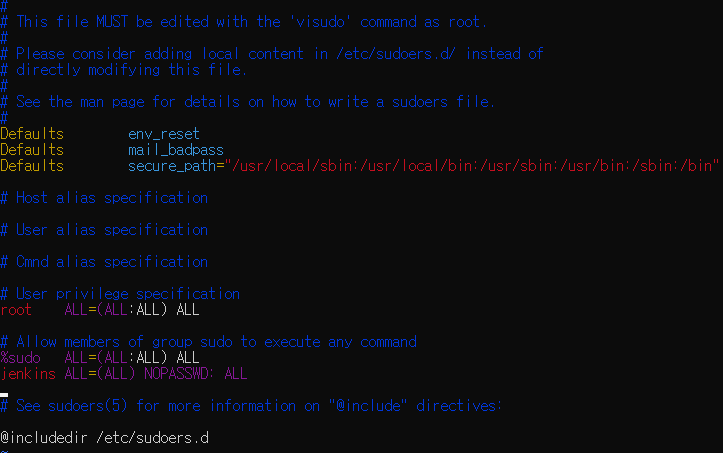 sudoers.d 파일이 열리면 #Allow members of group sudo to execute any command 아래에 jenkins를 추가해준다.