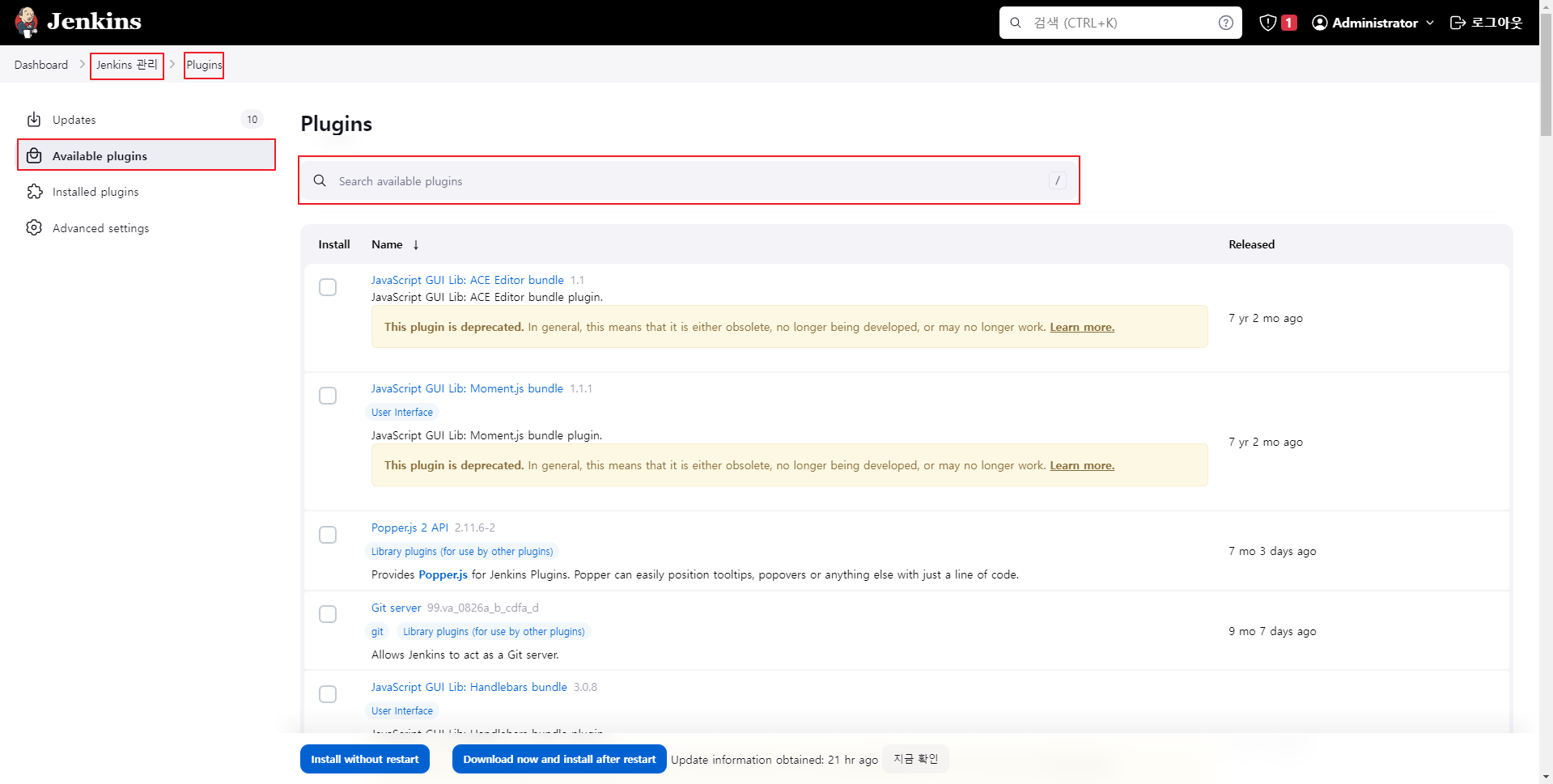(만약, Gitea 외에 다른 git을 사용한다면 github 등을 검색해보면 되겠다. 검색 결과로 나오지 않으면 설치되었을 확률이 높다. Installed plugins 메뉴에서 설치가 되었는지 확인해보자)