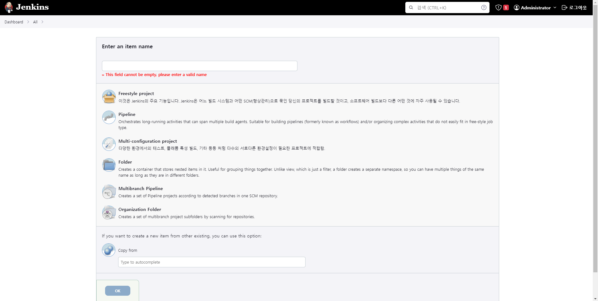 우선 Jenkins는 Project나 서비스를 생성하는 것을, Item을 생성하는 것으로 진행한다.