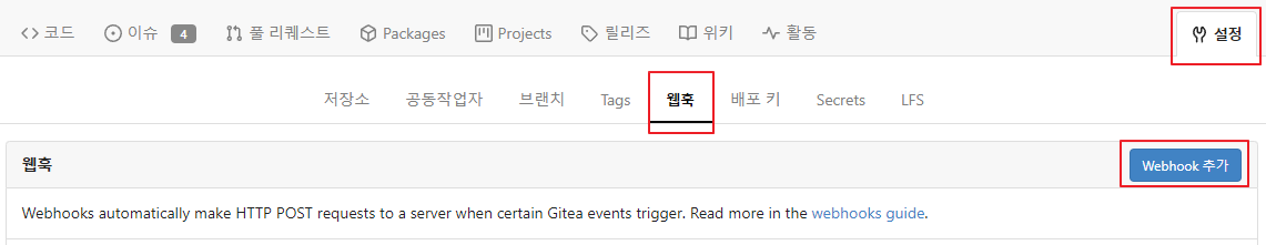 위와 같이 github나 gitea에서 repository의 설정에 들어가보면 웹훅 메뉴가 있다. 여기서 웹훅을 추가해주면 된다.